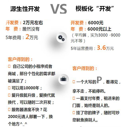什么是模板化開發(fā)?經(jīng)過討價還價,客戶轉(zhuǎn)給某一個開發(fā)平臺數(shù)千或上萬元“開發(fā)工錢”,開發(fā)平臺不久就給客戶一個商城、團購、預約功能的小程序鏈接(小程序名字基本就是客戶想要的),同時給一個帳號,客戶可以自己登錄的,能上傳一些產(chǎn)品圖片。所有小程序使用同一個后臺,不能個性化定制開發(fā),不能升級換代,更致命的是,不能遷移。當然,也不需要客戶提供服務器、域名,每年還要上交5000-6000元運營費。